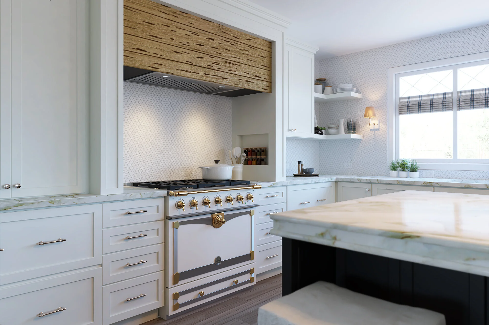 This small Galveston kitchen was shifted to an adjacent, under-utilized space to create and open kitchen with a central island, pecky cypress range hood and windows to the backyard. The new butler’s pantry connected to the kitchen plays with pattern to create a fun and interesting transition space between the new kitchen and moody dining room, with coastal touches.